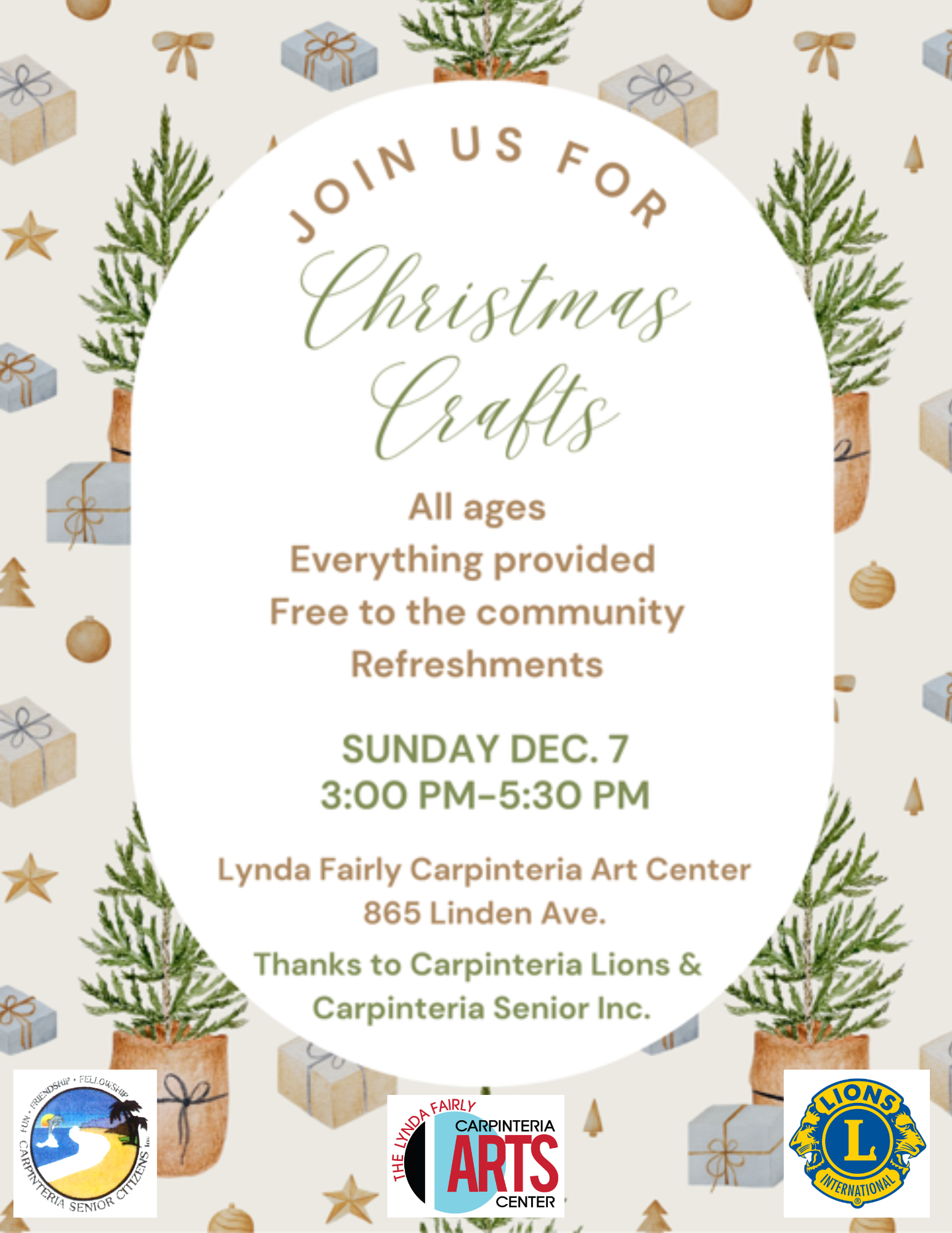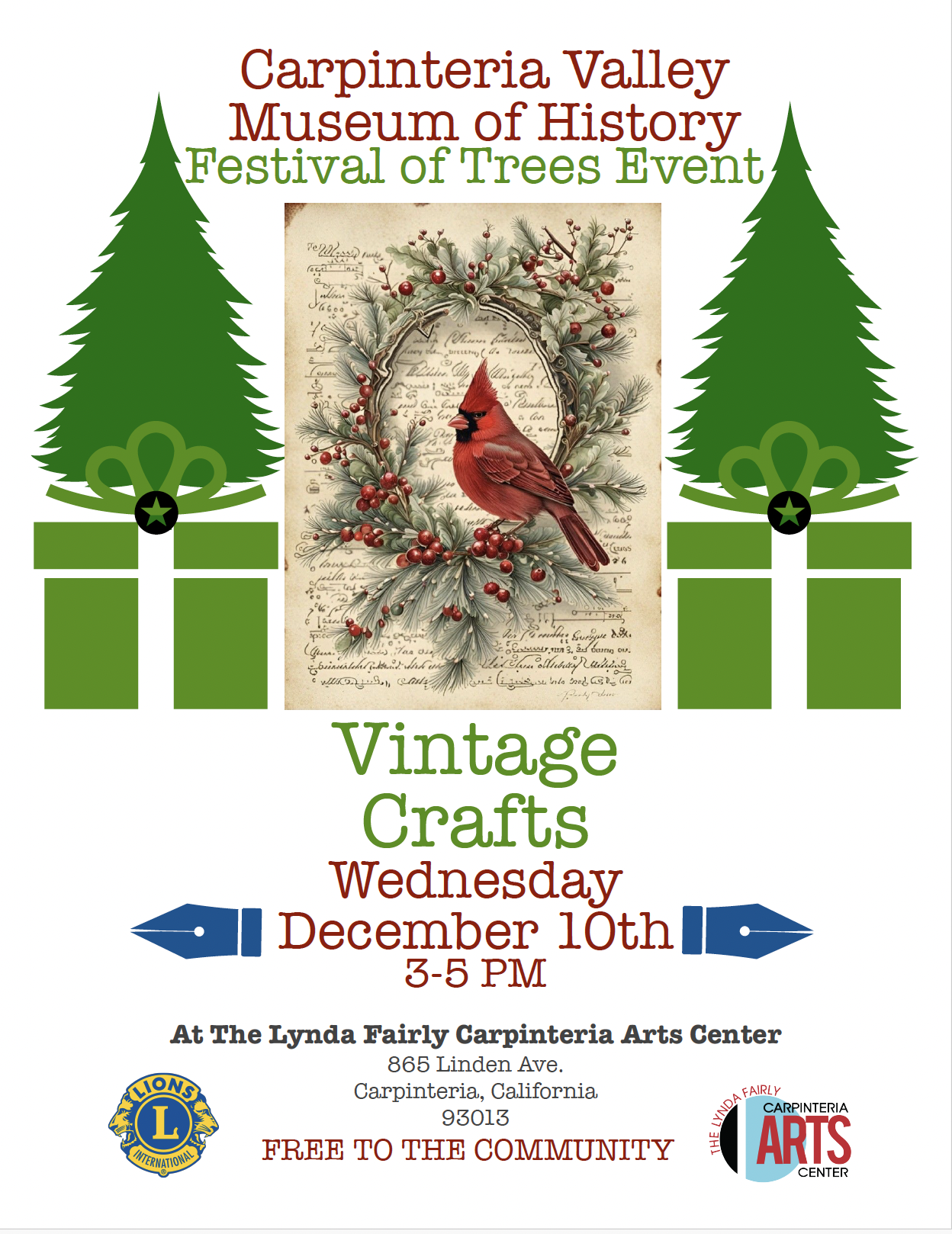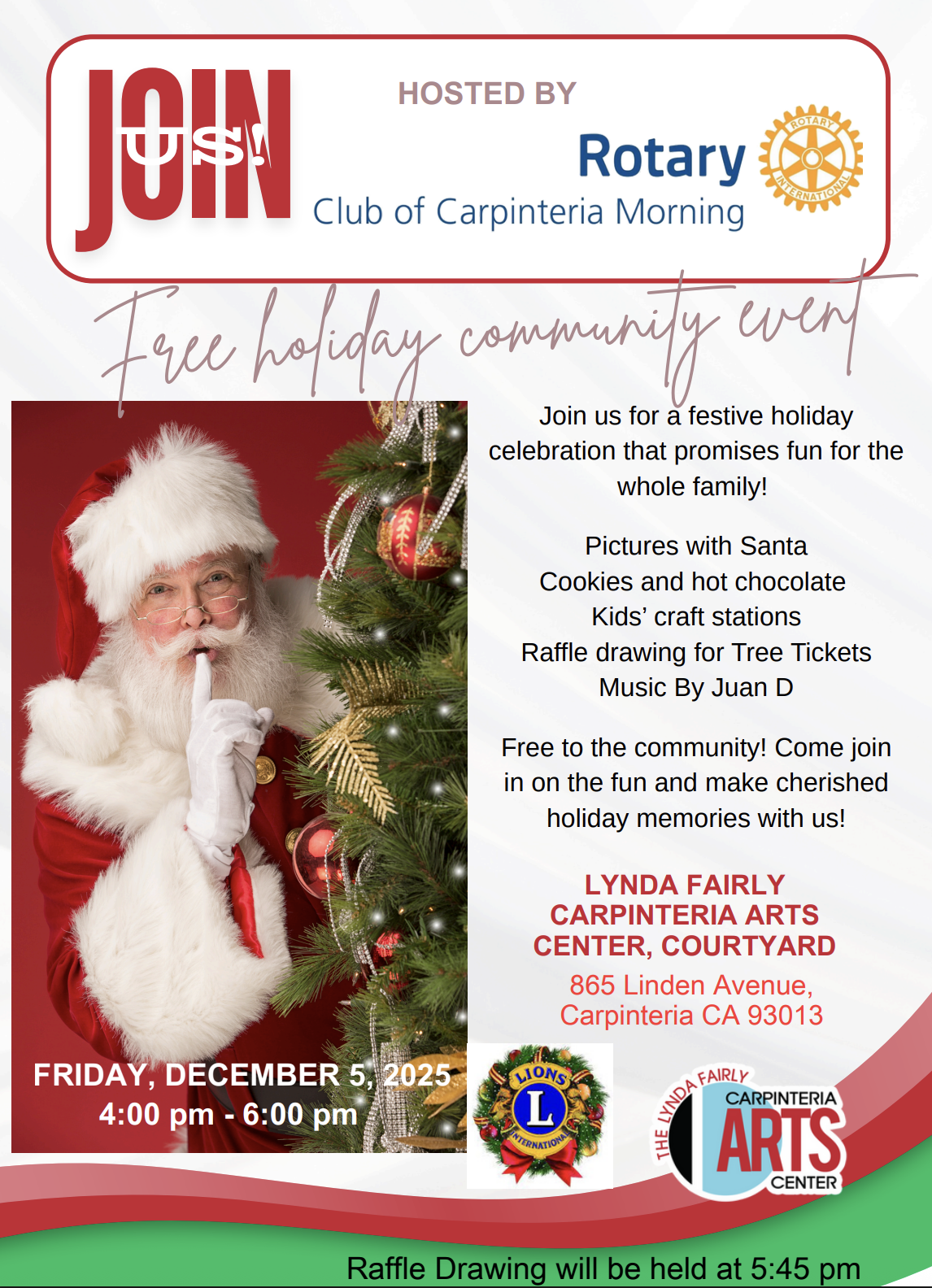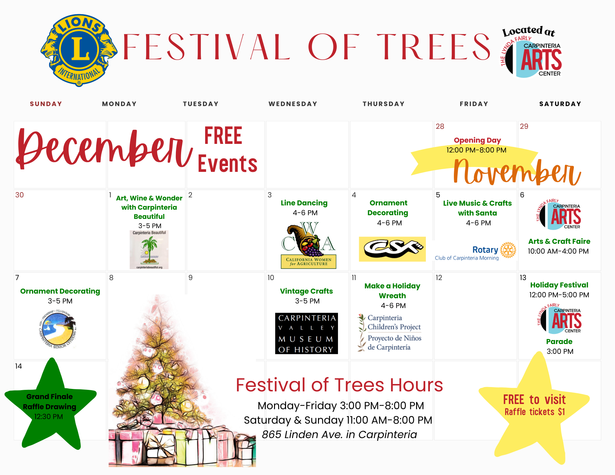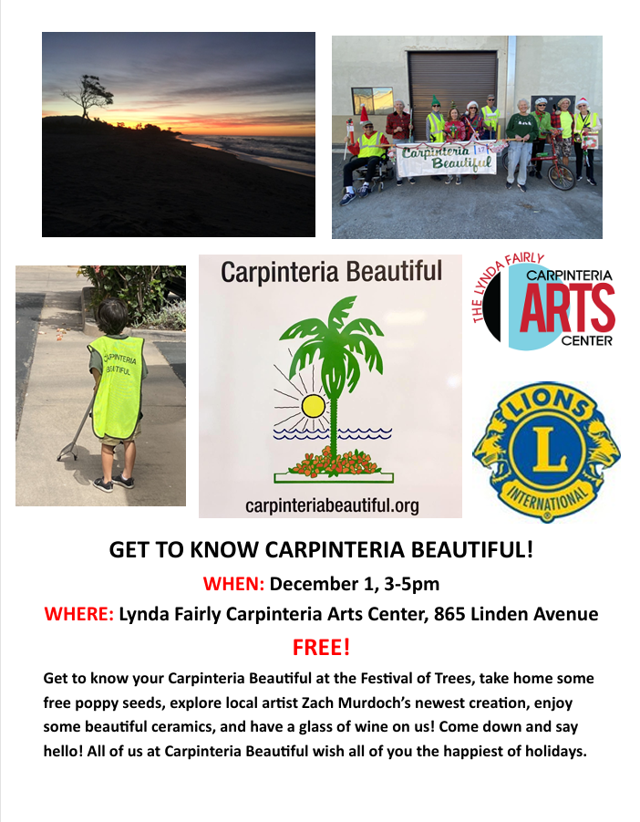 Presented by the Carpinteria Lions Club, and sponsored by local businesses and nonprofits, attendees will experience beautifully- decorated trees with various holiday themes on display daily through December 15th, the same day the raffle winners are announced. The event is free to walk through and enjoy, raffle tickets are available for purchase on site for only $1. Entering to win multiple times and for multiple trees is encouraged! Net proceeds will benefit the following nonprofits; the Lynda Fairly Carpinteria Arts Center, Carpinteria Beautiful, Carpinteria Children's Project, Carpinteria Seniors Inc., Carpinteria Skate Foundation, Carpinteria Valley Museum of History, California Women for Agriculture and the Rotary Club of Carpinteria Morning.This benefiting nonprofits will showcase a micro-event/experience showcasing their organization with a fun activity in our Koch Courtyard. Come enjoy the holiday season with us!
