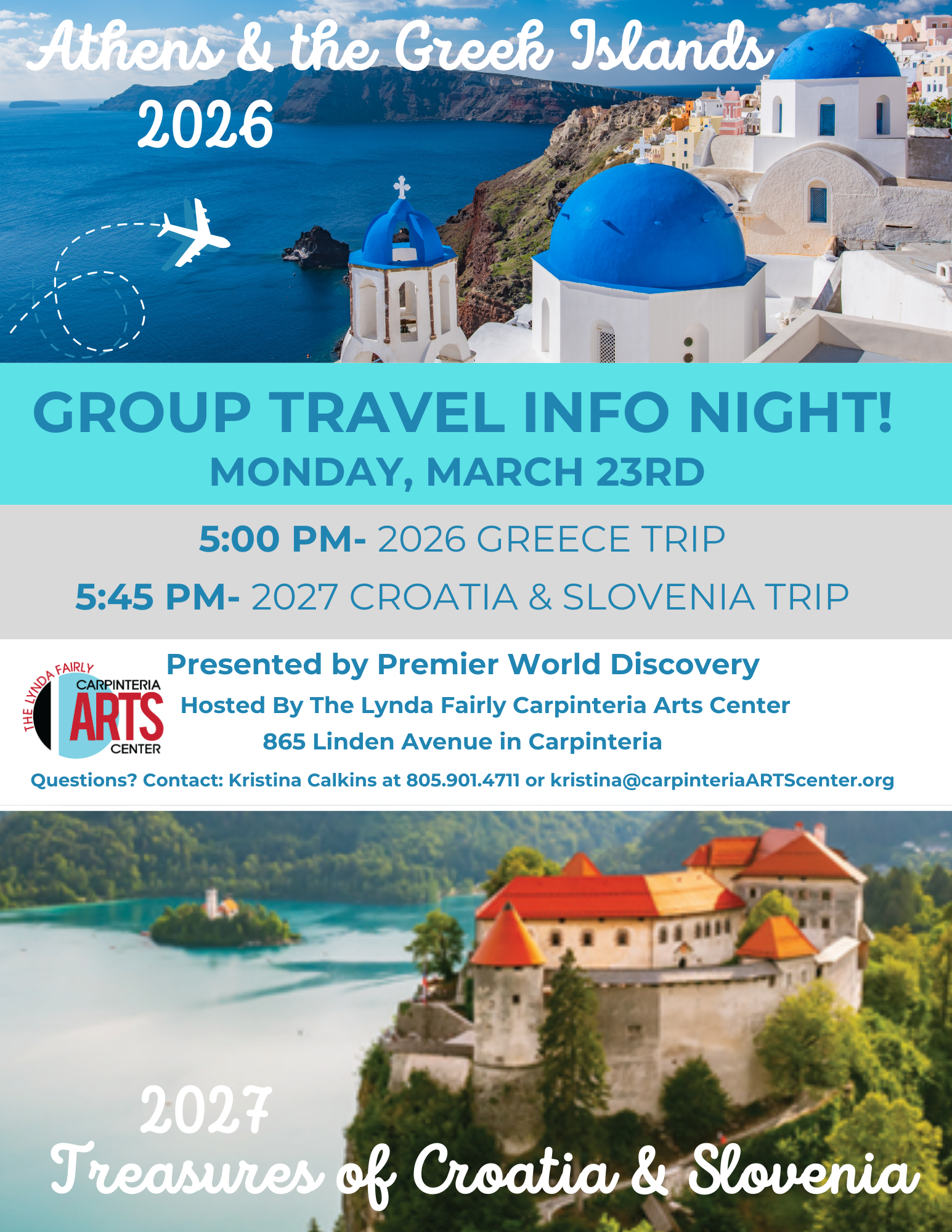 - Submit your Registration Form: Pick up a Greece Travel Brochure at the Carpinteria Arts Center or print off a copy (click on link below), complete the last page of the brochure, and drop off at the The Lynda Fairly Carpinteria Arts Center (865 Linden Avenue in Carpinteria) or mail to: P.O. Box 597, Carpinteria, CA 93014.