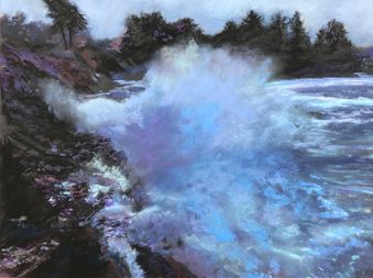 Description: In Crescent City Nocturne, I was drawn to the restless energy of the sea meeting the rocky shore. The soft pastel medium helps me capture the luminous spray and shifting blues of the water against the deepening shadows at dusk. The scene is both turbulent and serene, reflecting the mysterious beauty of the ocean as night falls.