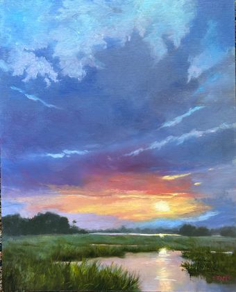 Description: The Carpinteria Salt Marsh was the inspiration for Marshland Sunset. I used an oil-primed linen board to paint the colorful sunset and muted blues in the skies to capture the effect I wanted in this painting.