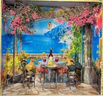 Description: Two chickens enjoying wine and cheese under a canopy of bougainvillea while overlooking the Amalfi coast. I love creating a miniature scene that allows the viewer to escape through imagination.