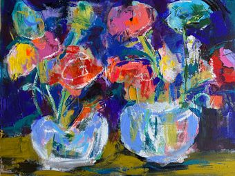 Description: "Here Comes Joy" is an abstract-like still life, the florals bursting with radiant color that glow with JOY.