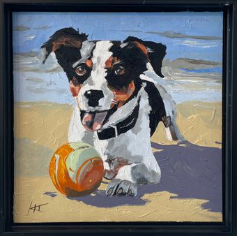Description: Whenever I think of blue, I immediately think of orange -- its perfect complement, its playful opposite. "Jackie," the little Jack Russell, isn't blue in the least; in fact, he's the picture of pure joy. He guards his favorite orange ball like it's a treasure beyond price.