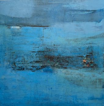 Description: Most people experience some kind of depression during their lives. It can come and go like drifting clouds. This painting expresses a moodiness with fluctuations of dark and light blues and swaths of shaded blacks. While painting this piece, I was aware of my core intentions to create worlds within worlds with an atmosphere of mystery.