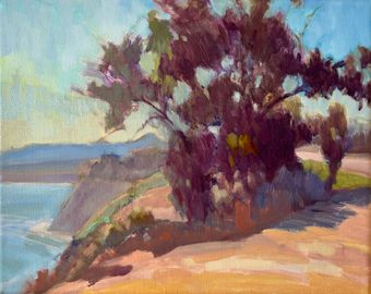Description: Dusky silhouette of a weathered eucalyptus on the cliff's edge overlooking the Pacific Ocean.