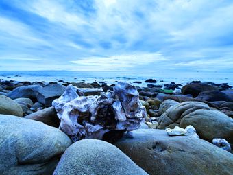 Description: I was drawn to the way this gnarled wood rests among the beach stones, weathered and worn, while sunlight spills through the breaking clouds.
