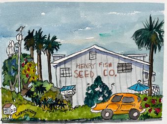Description: I've been noticing that unintentional themes appear in my work that constantly surprise me. This painting of Carpinteria's beloved Palm Loft Gallery displays an orange car that keeps showing up unannounced in my paintings...as well as dashes of turquoise that I can't really explain. (The bird was really there, though.) Painted plein air across from Palm Avenue this past summer (2025).