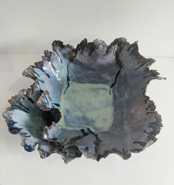 Description: Coastal Bloom is a ceramic vessel that captures the spirit of Carpinteria's shoreline in sculptural form. With its ruffled, coral-like edges and luminous glaze, the bowl evokes the delicate beauty of tide pool flora and the vibrant hues of ocean mist at sunset. Shades of seafoam green, deep indigo, and violet swirl across the glossy interior, creating a gradient that mirrors the shifting light over the Pacific. The jagged, organic rim suggests petals caught in motion or the rugged contours of coastal rock formations, inviting viewers to reflect on nature's balance between chaos and harmony. Both functional and expressive, this piece celebrates the textures and colors that define our coastal environment, where land meets sea, and art meets life.