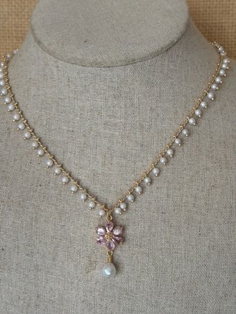Materials: Gold Plated Chain, Pearl Dangles, Pink Glass Flower Pendant, Pearl Drop