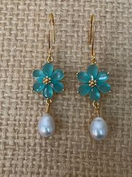 Jewelry Artist: Marcia McNallyDimensions: Turquoise glass flower earrings with pearl dangle, 2