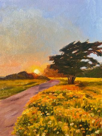 Description: This painting was inspired by a spring evening when the setting sun briefly transformed the fields into gold. Through warm color and expressive brushwork, I aim to capture the quiet feeling of standing within that glow.