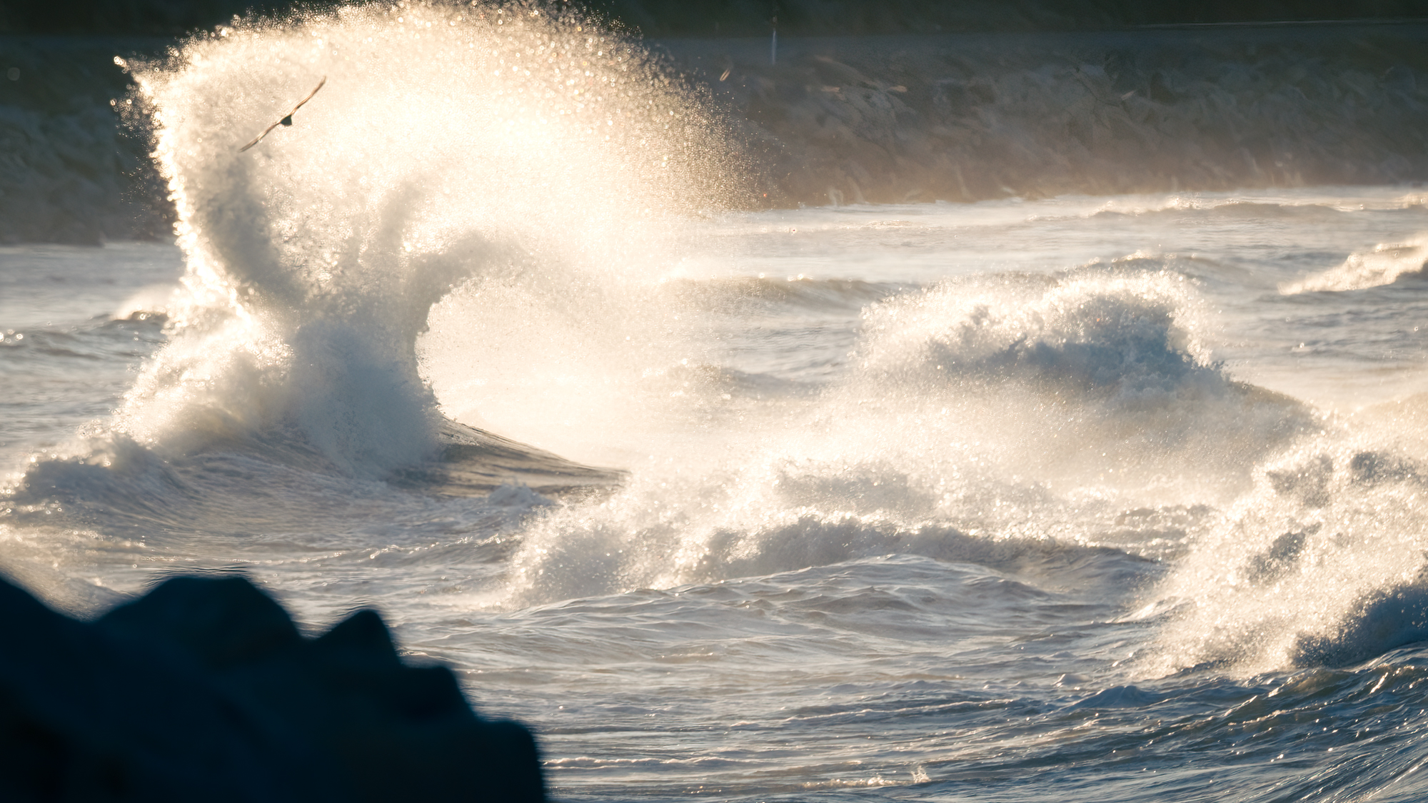 Description: A lone seagull flies close to the shoreline as the seawater explodes from a backwash wave.