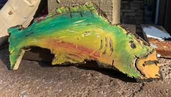 Description: 1: मछली (fish): bosa wood. 12 X 6x1. Carve, burn, and acrylic. My art is intended to convey the rough textures of the natural world and convey the beauty of everyday material, emphasizing the synchronization between the admired object and that which surrounds it. Also, my goal is to up-cycle that which is bound for the dumpster. I use burning, Swiss carving tools, oil, and acrylic in grooves. I sand & wash the wood to let it expand, then apply paint and additional cuts. My media is used wood siding, discarded dog-eared fence slats, and a simple piece of pine box. I developed my interest when circumstances prevented me from one of my favorite pastimes, hiking. I realized it wasn't the viewpoint I missed, but the cracks in the soil of a well-worn path.