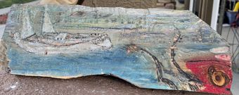 Description: My art is intended to convey the rough textures of the natural world and convey the beauty of everyday material, emphasizing the synchronization between the admired object and that which surrounds it. Also, my goal is to up-cycle that which is bound for the dumpster. I use burning, Swiss carving tools, oil, and acrylic in grooves. I sand & wash the wood to let it expand, then apply paint and additional cuts. My media is used wood siding, discarded dog-eared fence slats, and a simple piece of pine box. I developed my interest when circumstances prevented me from one of my favorite pastimes, hiking. I realized it wasn't the viewpoint I missed, but the cracks in the soil of a well-worn path.