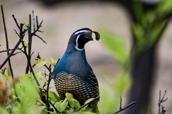 Description: I was out for a morning walk when I saw this bird perched on a shrub. I normally see them in a group on the ground. It was overcast, so the light really emphasized the bird's colors while being bright enough to produce that little catchlight in the eye.