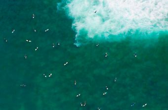 Description: This photograph was taken from a Cessna airplane during Hurricane Marie, when Rincon was packed with surfers. From above, I was drawn to the luminous color of the water and the tiny figures below, surfers scattered like brushstrokes across the wave, their boards adding flashes of color. The aerial perspective transformed a familiar break into something entirely new.