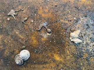 Medium: Bronze, sea shells, gold leaf, sand, resin, and acrylic paint on wood panel