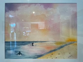 Description: I feel inspired to paint when the pinks, oranges and purples in the sky combine to make that lovely color of "plorange" and it reflects on the ocean water during our winter evenings.