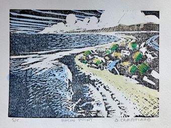 Description: A print using oil-based ink, and then painted with watercolor. Image of Rincon beach, water, and homes.