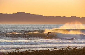 Description: Riding solo through the last sets before dark, the surfer adds some color to the offshore dusk magic.